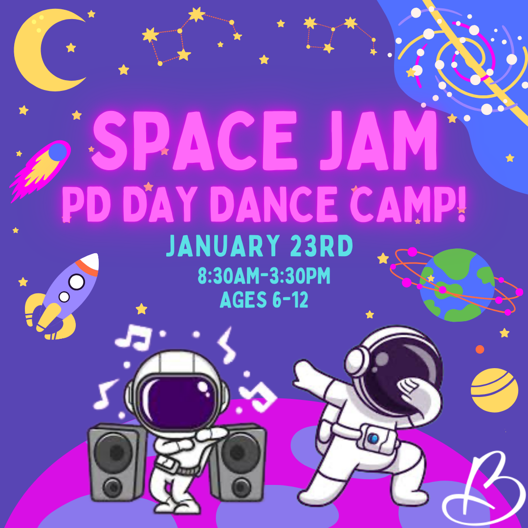 Blast off into a world of intergalactic fun at our Space Jam Dance Camp! Perfect for dancers ages 5-12, this camp combines basketball, aliens, and out-of-this-world dance moves. Kids will explore Ballet, Jazz, Tap, Acro, and Hip Hop while imagining themselves bouncing, spinning, and jamming through space! Play themed games, make cosmic crafts, and let your child’s creativity soar to infinity and beyond!