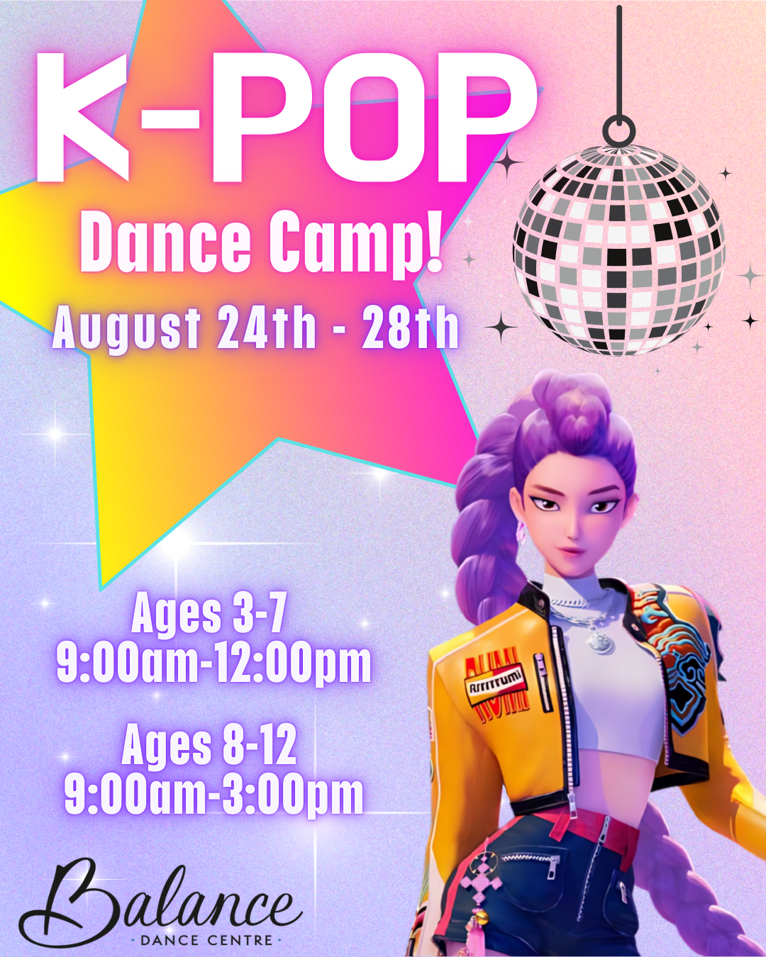 Annyeong, Campers! Get ready for big stage energy at our K-Pop Superstar Week! Campers will train in jazz, ballet, hip hop, acro, and yoga while learning dynamic choreography and building confidence like true idols. They’ll form their own groups and performing fun band themed concepts, each dancer will become a superstar! It’s going to be a high-energy week full of teamwork, sparkle, and star power!