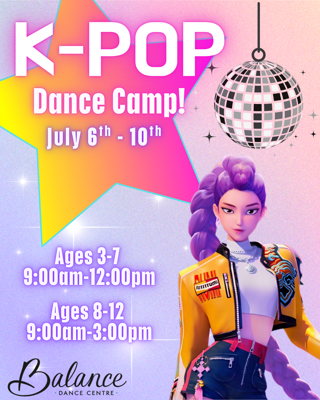 Annyeong, Campers! Get ready for big stage energy at our K-Pop Superstar Week! Campers will train in jazz, ballet, hip hop, acro, and yoga while learning dynamic choreography and building confidence like true idols. They’ll form their own groups and performing fun band themed concepts, each dancer will become a superstar! It’s going to be a high-energy week full of teamwork, sparkle, and star power!